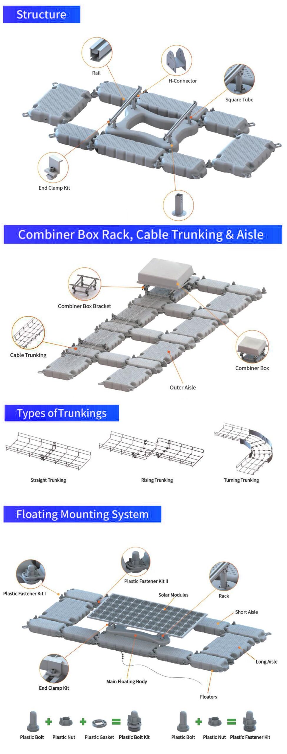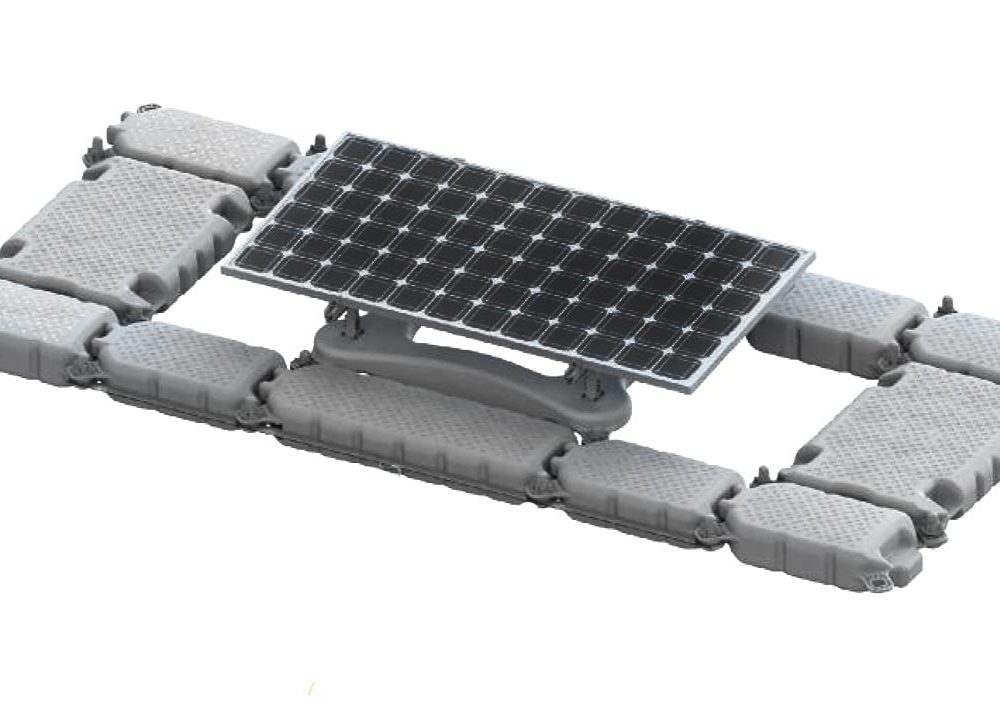 These are the buoyant structures that support the solar panels and are typically made of HDPE for its durability and resistance to UV, water absorption, and aging. |