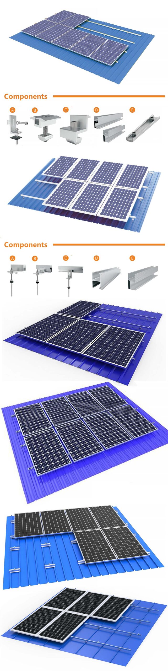 These provide the structural framework for attaching the solar panels. They can be made of aluminum or steel and are designed to handle wind and snow loads. |