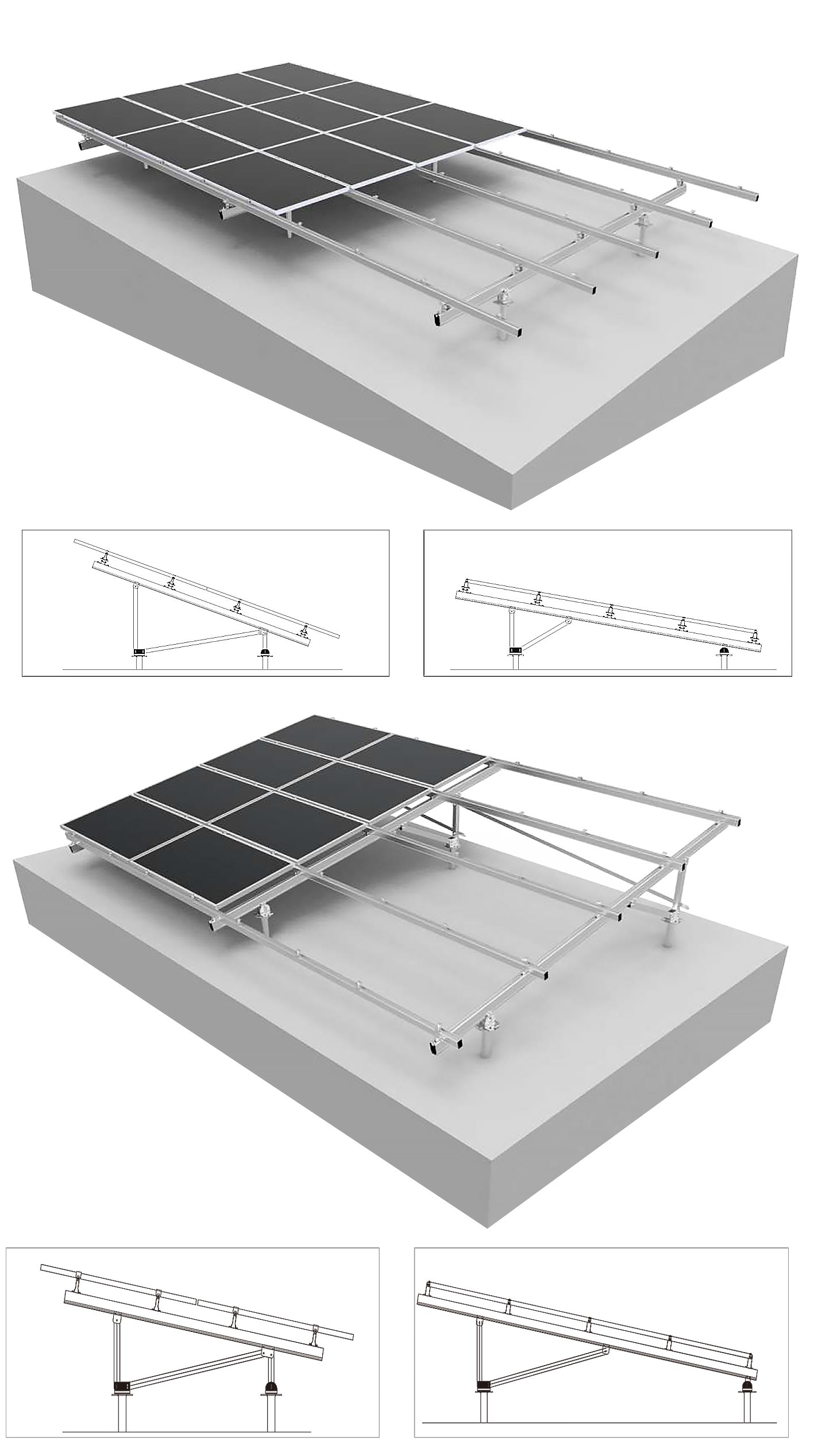 Ground mounts can utilize different foundation types, including ballasted (concrete blocks), screw piles, or direct-fix methods, depending on site conditions and project requirements. |