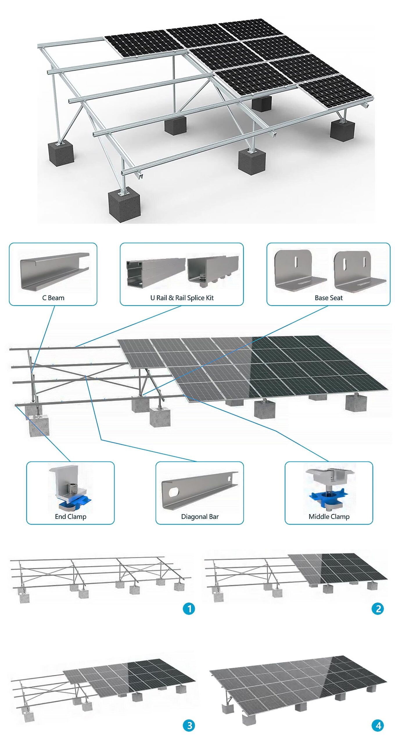 Ground mounts can utilize different foundation types, including ballasted (concrete blocks), screw piles, or direct-fix methods, depending on site conditions and project requirements. |