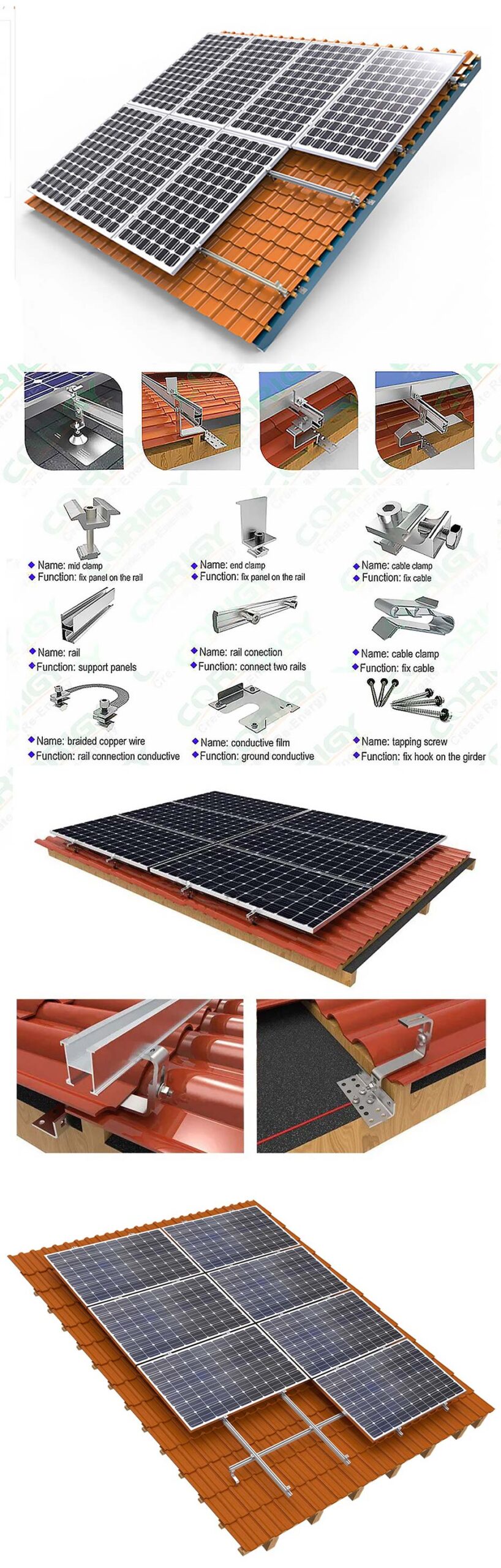 The mounting system components should be compatible with the roof material (e.g., tile, metal sheeting, slate) to ensure proper installation and long-term durability. |