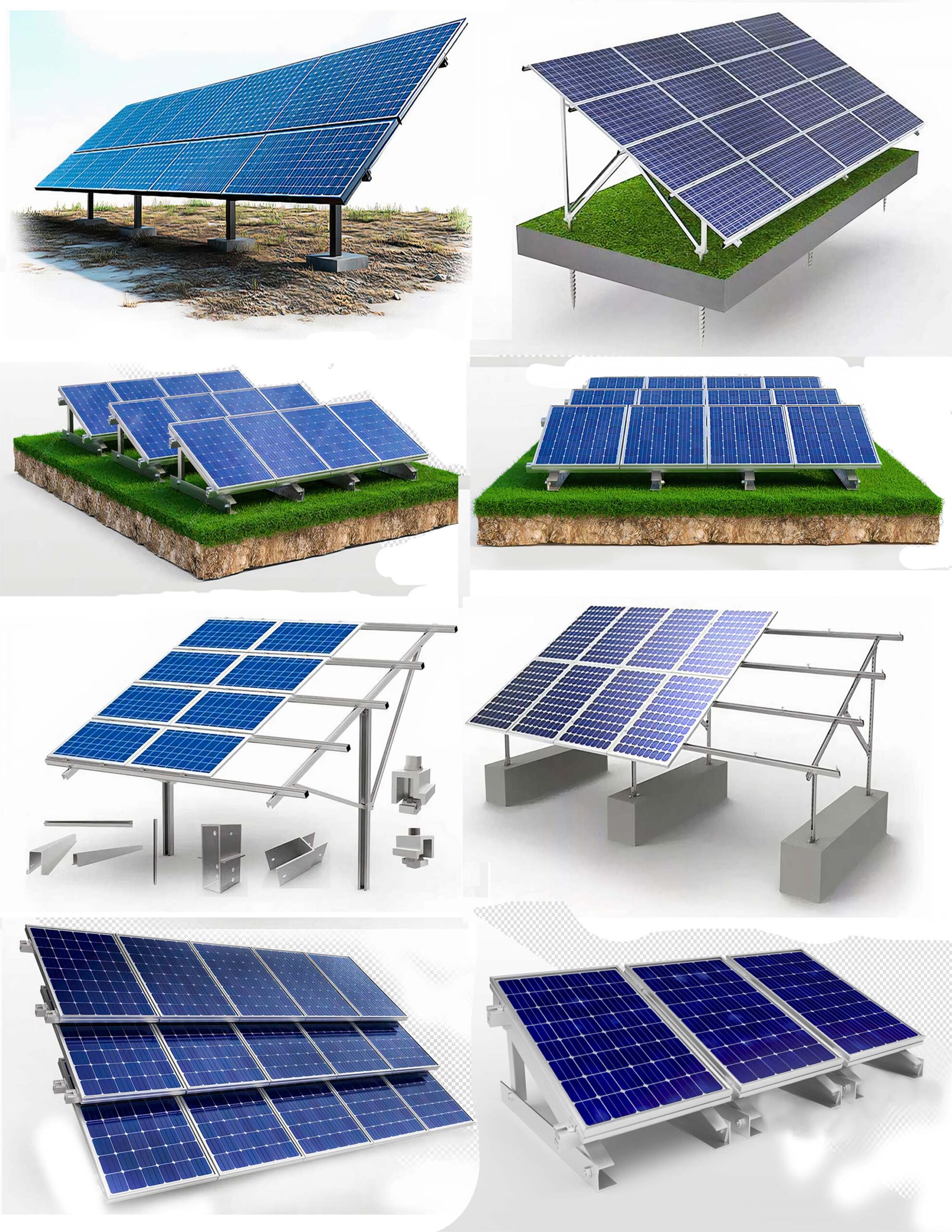 Ground mounts can utilize different foundation types, including ballasted (concrete blocks), screw piles, or direct-fix methods, depending on site conditions and project requirements.